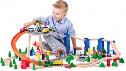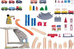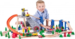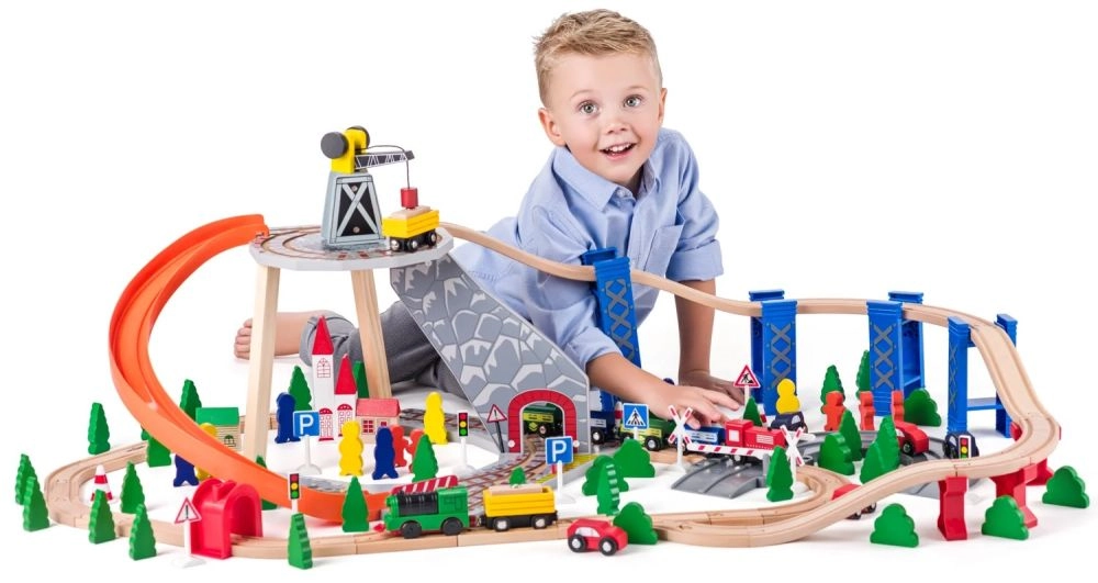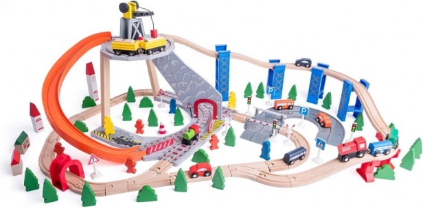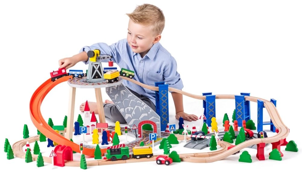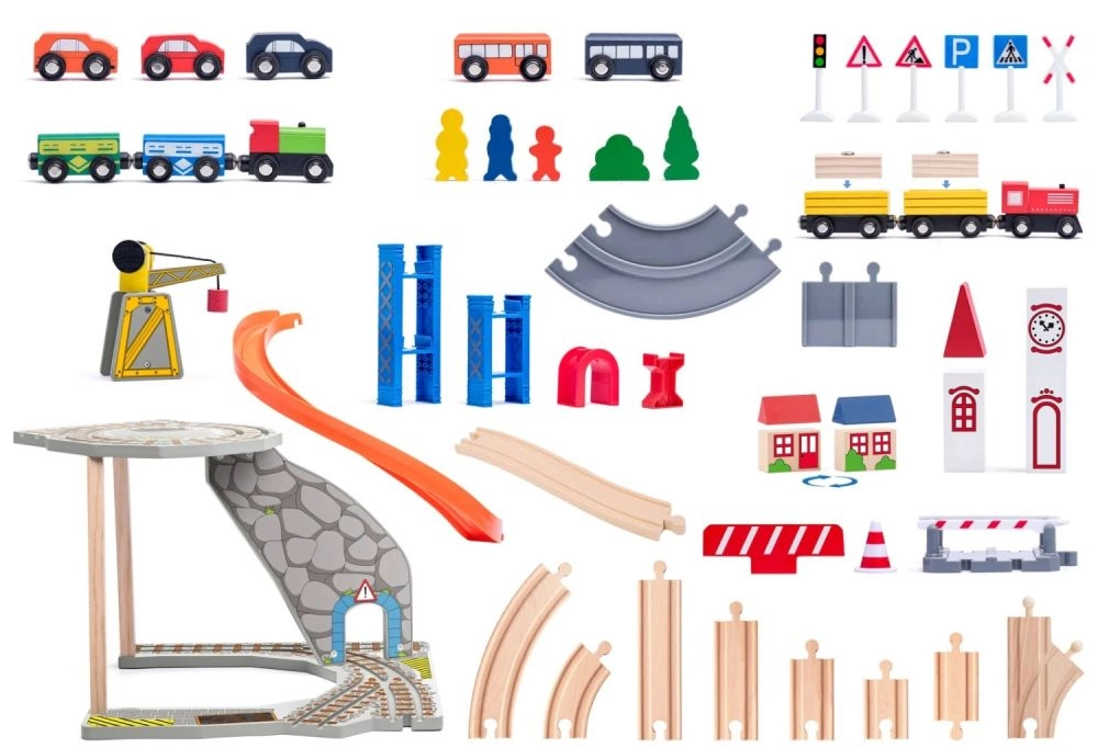 Tento velký železniční svět kombinuje dřevěné koleje, mosty a tunely s pestrými vláčky, auty a autobusy, dopravními značkami a figurkami. Funkční jeřáb snadno překládá náklad, takže si děti mohou postavit vlastní město s nádražím, silnicemi i křižovatkami. Vše je navrženo pro bezpečnou a dlouhotrvající zábavu.