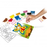 - 2 obrázky k vybarvení, patříčko, 11 sáčků s barevným pískem, návod