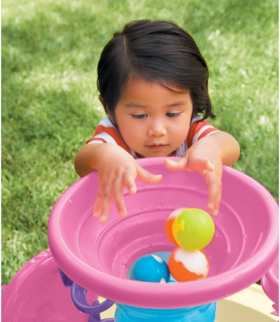 Děti nalévají vodu do velkého růžového trychtýře, sledují proudění a točení míčků či vody po spirále – zábavná cesta k pochopení jednoduchých fyzikálních jevů.
