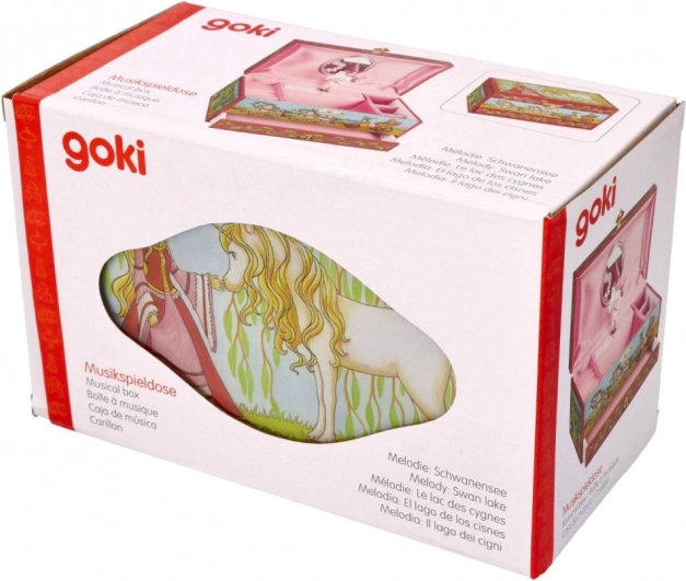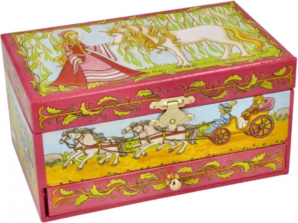 Šperkovnice ve stylu hrací skříňky je ideálním doplňkem pro malé dámy, které chtějí mít své šperky uloženy s elegancí. Po otevření začne hrát melodie z opery Labutí jezero a bílý koník se roztančí před zrcadlem.
