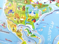 Mapa obsahuje názvy oceánů, států a měst v angličtině. Dílky jsou vyrobeny z pevné dřevěné překližky se zabudovanými magnety. Výrobek je navržen tak, aby se dal snadno zavěsit na stěnu.