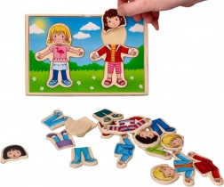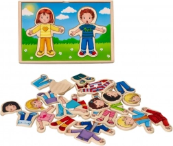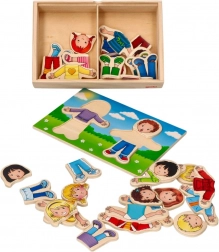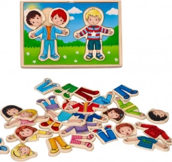 Tato oblíbená oblečková skládačka je vyrobena z kvalitního dřeva, které je nejen odolné, ale také ekologické. Dodává se v praktické dřevěné krabičce s víkem, která slouží zároveň jako podložka pro skládání. Děti si díky výměně hlav, těl a nožiček mohou vytvářet nespočet kreací a užívat si při tom spoustu zábavy.