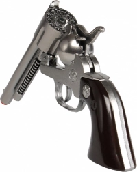 Stylový kovbojský revolver v klasickém designu potěší malé pistolníky i milovníky westernové atmosféry. Kovové tělo dodává hračce odolnost a příjemnou hmotnost v ruce, zatímco výrazná špička jasně ukazuje, že se jedná o bezpečnou hračku. Díky bubínku na 12 ran je hra plynulá a zábavná.