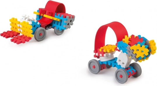 Mini stavebnice Waffle s 35 elementy, která nabízí nové možnosti konstrukce. Bezpečný a tichý materiál vhodný pro děti, s inovativní technologií výroby umožňující flexibilitu.