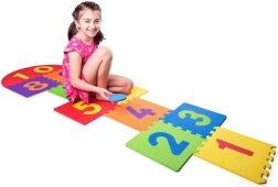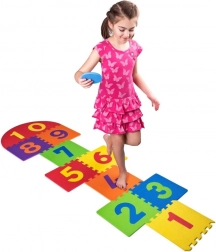Skákání po očíslovaných dílech a házení koleček rozvíjí rovnováhu, koordinaci, obratnost i numerické vnímání.