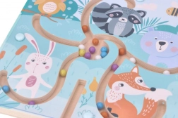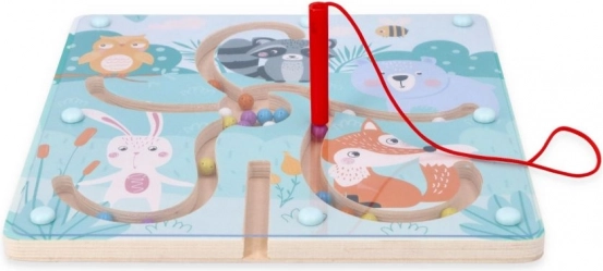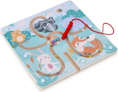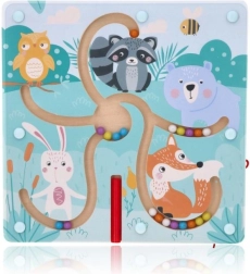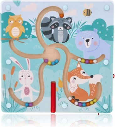 Dřevěný magnetický labyrint s motivem lesních zvířátek nadchne malé objevitele už od 2 let. Pomocí magnetické tyčinky budou děti posouvat barevné kuličky po cestičkách, trénovat jemnou motoriku, koordinaci oko–ruka i logické myšlení. Kuličky chrání průhledný kryt, tyčinka je na šňůrce a kompaktní rozměry 22,5 × 22,5 cm z něj dělají ideální cestovní hračku. Certifikace CE.