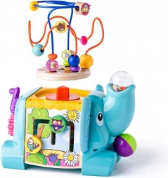 Interaktivní slon v pestrých barvách je navržen tak, aby děti motivoval k objevování. Korálkový labyrint, otáčecí kolečka, posuvné prvky a převody přinášejí spoustu způsobů, jak trénovat prsty, úchop i logické myšlení. Hračka je stabilní, snadno se drží a láká k opakované hře.