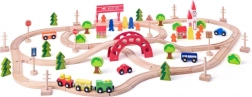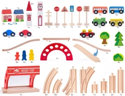 Dřevěná vláčková dráha s mostem nabízí spoustu zábavy a podporuje spolupráci mezi dětmi. Obsahuje mnoho různorodých dílků, které děti musí sestavit, což přináší další zábavu.