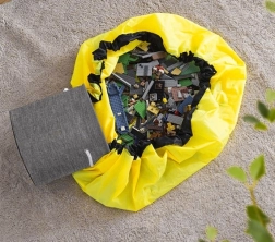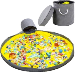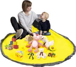 Rozložte velkou podložku (Ø 135 cm), nechte děti hrát a po skončení zatáhněte za šňůru se stopperem – hračky se během okamžiku schovají do koše.