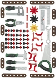 Pilka, kladivo, klíče, obcínky, pilníky, šrouby i spojky – vše, co dítě potřebuje pro stavění a šroubování.