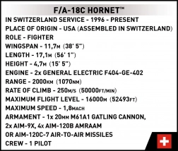 Tento model je skvělým dárkem pro fanoušky letectví a vojenské techniky všech věkových kategorií. Díky licencovanému designu se dokonale hodí jak do pokoje teenagera, tak do reprezentativní kanceláře. Model F/A-18C Hornet nahrazuje francouzské Mirage IIIS ve švýcarském letectvu od roku 1992, kdy bylo objednáno 34 letounů v různých verzích.