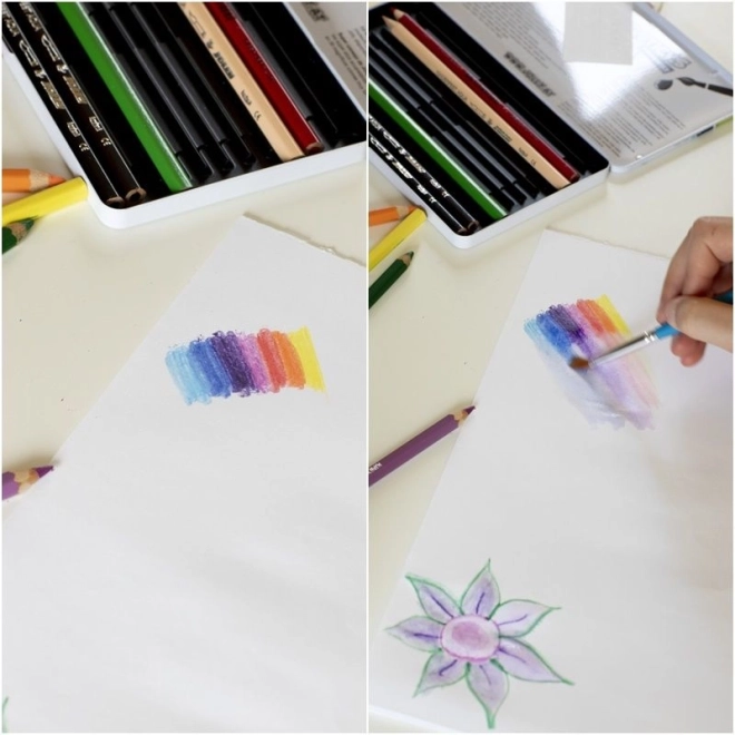 Pastelky lze jednoduše rozmývat vodou – stačí pár tahů štětcem a vzniknou jemné akvarelové přechody a efekty.