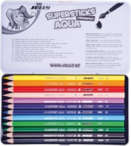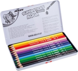 Objevte kreativní možnosti s akvarelovými pastelkami JOLLY Supersticks Aqua. Používejte je nasucho pro syté krytí nebo přidejte vodu a proměňte tahy v jemné akvarelové malby. Kovová krabička chrání pastelky na cestách i doma a udržuje je přehledně uspořádané.
