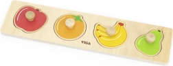 Tato kvalitní dřevěná vkládačka s motivy ovoce (jablko, pomeranč, banán, hruška) je navržena pro malé dětské ruce. Každý dílek má dřevěný úchyt pro snadnou manipulaci, což podporuje rozvoj jemné motoriky a samostatnosti.
