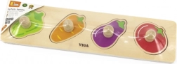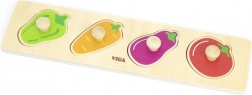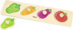 Tato kvalitní dřevěná skládačka se zeleninovými tvary (paprika, mrkev, lilek, rajče) je ideální první puzzle pro děti od 1 roku. Velké dílky s úchopovými knopky podporují správný úchop, trénují koordinaci oko–ruka a pomáhají dětem rozlišovat barvy a tvary.