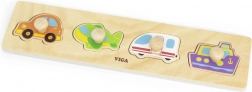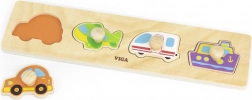 Veselé barvy a zřetelné obrysy pomáhají rozvíjet zrakové vnímání a slovní zásobu – dítě poznává auto, loď, letadlo či karavan a učí se je pojmenovat. Kvalitní dřevěné zpracování zajišťuje dlouhou životnost a bezpečné hraní.
