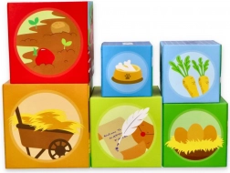 Sada stohovacích kostek s ilustracemi farmy, doplněná dřevěnými figurkami zvířat
