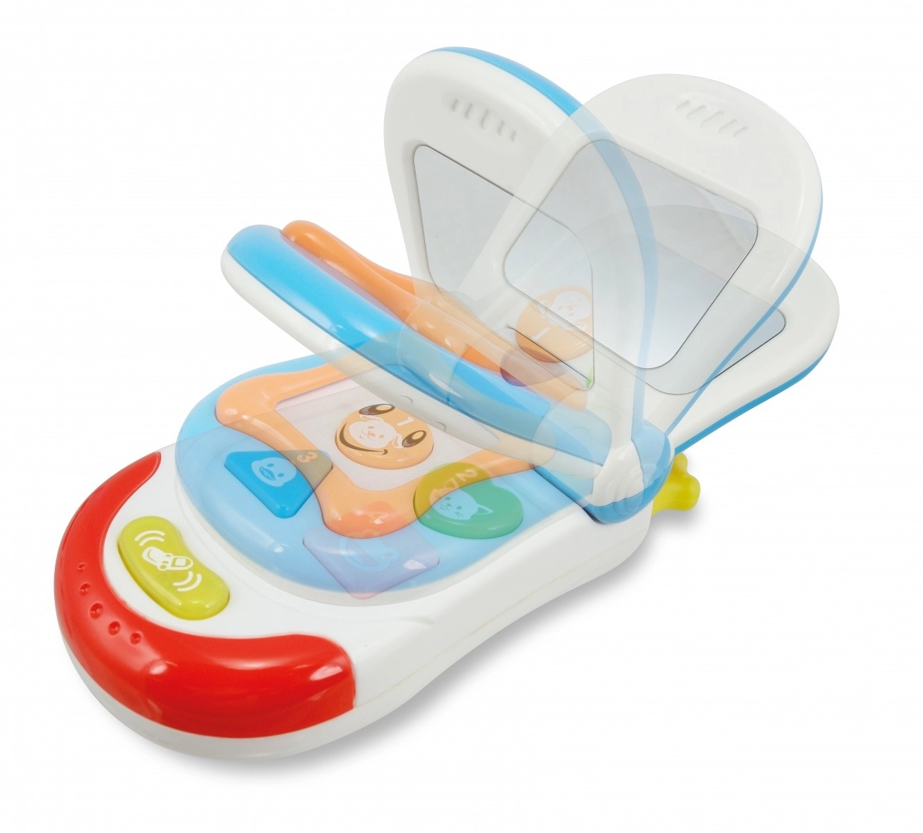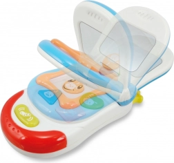 Usměvavý telefon je aktivní hračka, která děti zaujme na dlouhý čas. Díky pohyblivé klapce, veselým melodiím a blikajícím světýlkům rozvíjí sluch, zrak i jemnou motoriku. Po otevření klapky se objeví bezpečné zrcátko pro zábavné grimasování a objevování vlastního odrazu.