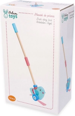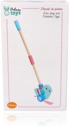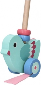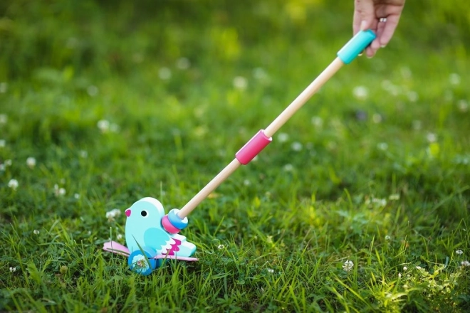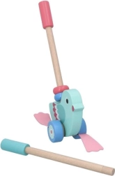 Tento krásný dřevěný ptáček k tlačení je navržen tak, aby pomáhal dětem ve věku od 12 měsíců s rozvojem pohybových a rovnovážných schopností. Díky odnímatelné tyči, která dosahuje délky 48 cm, je hračku snadné tlačit a manipulovat s ní. Celkový design kombinuje turquoise tělo a růžová křídla, což stimuluje dětskou představivost a smysl pro barvy.