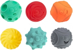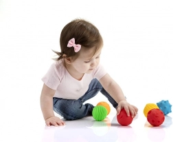 Každý míček má jiný povrch a výraz, které probouzí zvědavost a podporují smyslové vnímání i jemnou motoriku.
