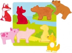 Tato kvalitní dřevěná vkládačka se čtyřmi zvířátky (liška, pejsek, medvěd, prasátko) skrývá pod vyfrézovanými otvory hmatové plochy, které napodobují jejich srst nebo kůži. Děti tak při hře zapojují zrak i hmat a lépe si propojí tvary, barvy a smyslové vnímání.