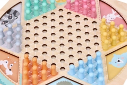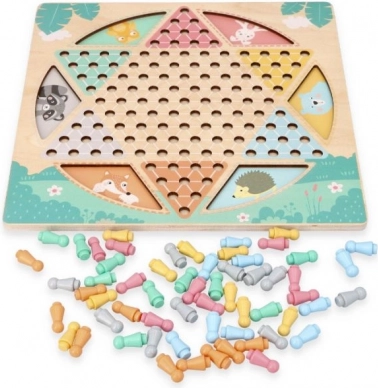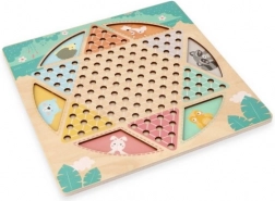 Oboustranná dřevěná deska o rozměru přibližně 30 × 30 cm je zdobena jemnými motivy zvířátek a doplněna barevnými, snadno uchopitelnými figurkami. Díky pevnému provedení a přehledné grafice je ideální pro společné hraní dětí i dospělých.
