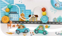 Dvě ozubená kola, posuvné korálky a autíčka i otáčecí postavičky trénují úchop, koordinaci a logické uvažování.