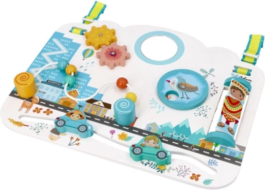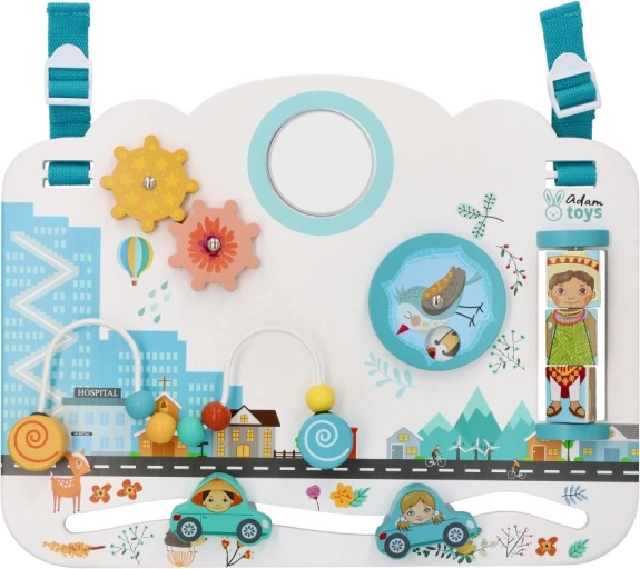 Objevte kouzlo učení hrou se smyslovou tabulí od značky ADAM TOYS. Tato dřevěná aktivní tabule nabízí multifunkční zábavu pro nejmenší už od 6 měsíců. Barevná městská scéna, pohyblivé prvky, bezpečné zrcátko a otáčecí kolečko rozvíjejí jemnou motoriku, koordinaci oko–ruka a představivost. Díky nastavitelným popruhům ji snadno zavěsíte na postýlku a dopřejete dítěti podnětné hraní kdykoli během dne.