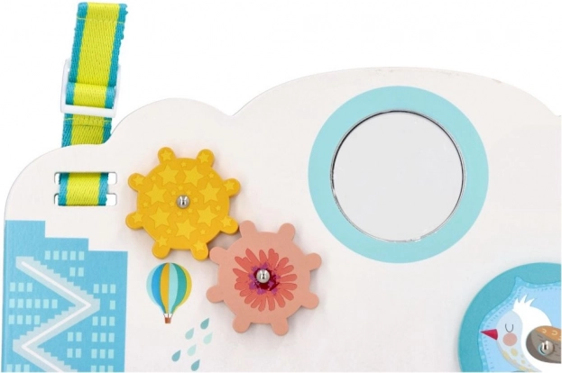 Interaktivní prvky jako ozubená kolečka, posuvné korálky a autíčka, bezpečné netříštivé zrcátko či otáčecí kolečko se skrytými zvířátky podporují jemnou motoriku, soustředění a příčinné myšlení. Díky regulovatelným popruhům je tabule praktická doma i na cestách – lze ji postavit před dítě nebo zavěsit na postýlku.