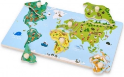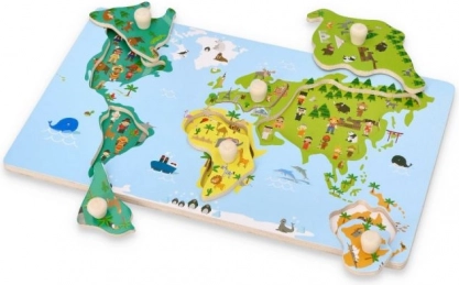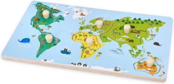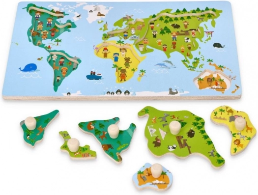 Puzzle zobrazuje kontinenty s výraznými barvami a kreslenými zvířaty a památkami, což dětem usnadňuje učení a dělá geografii zábavnou.