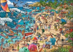 Sestavené puzzle má rozměry přibližně 70 x 50 cm a je ideální pro společné rodinné chvíle nebo relaxaci o samotě. Ponořte se do živé atmosféry pláže, kde si lidé užívají surfování, plavání a odpočinku za slunečného dne.
