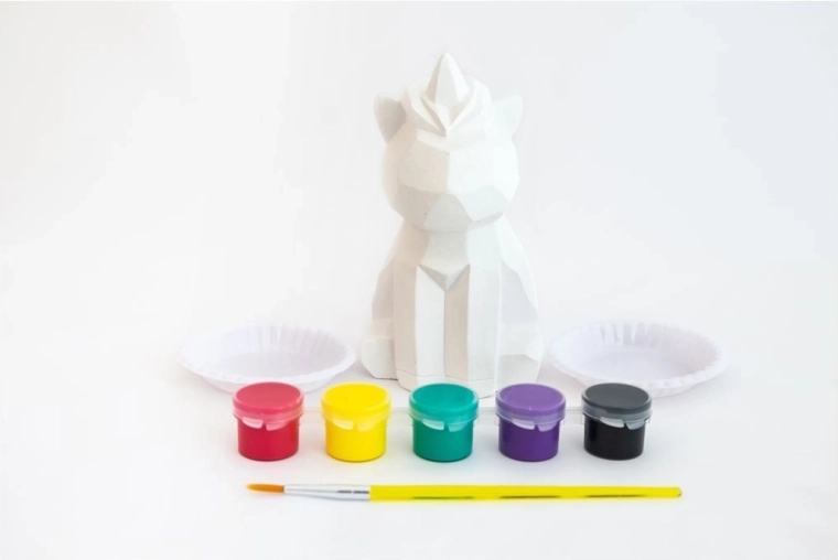 - Kompletní set – figurka jednorožce, 5 barev, štětec a 2 tácky na míchání.