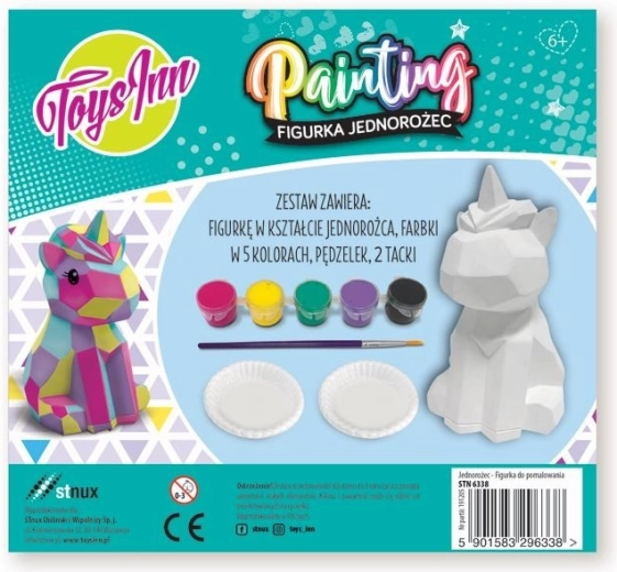- Figurka jednorožce k malování, 5 barev, štětec, 2 tácky na míchání