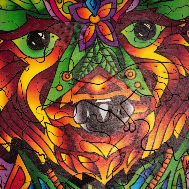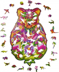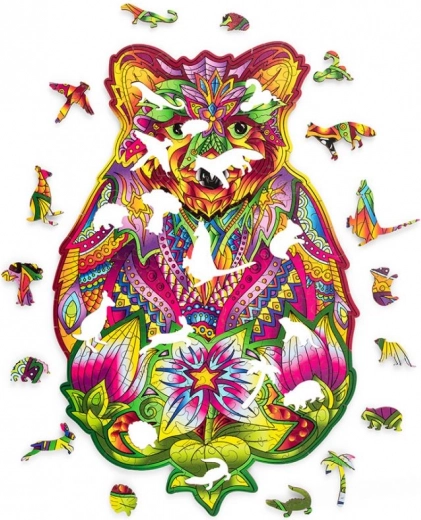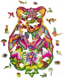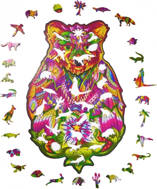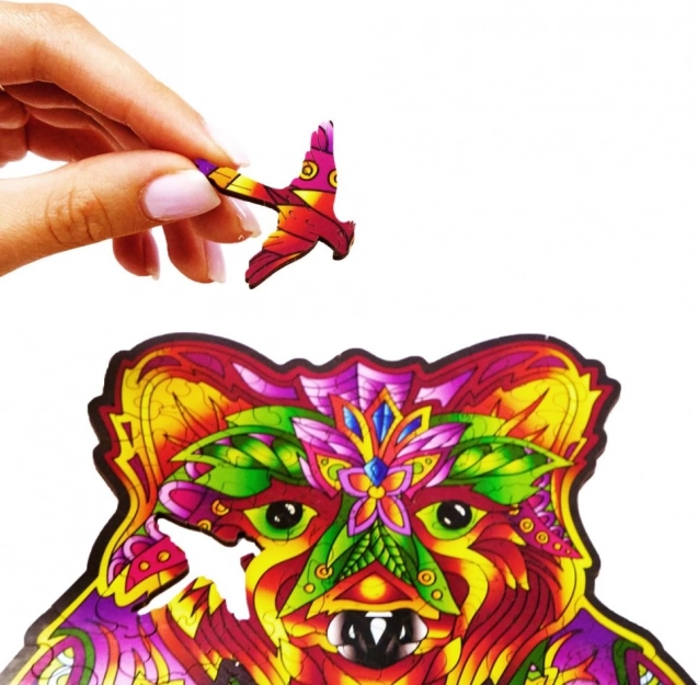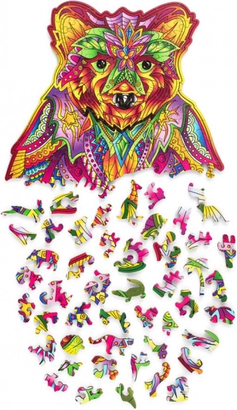 Toto dřevěné puzzle ve tvaru medvěda přináší jedinečný kombinovaný zážitek – relaxační skládání a výsledný umělecký obraz. Díly v zářivých barvách, včetně speciálních tvarů zvířátek, podporují soustředění, trpělivost a jemnou motoriku.