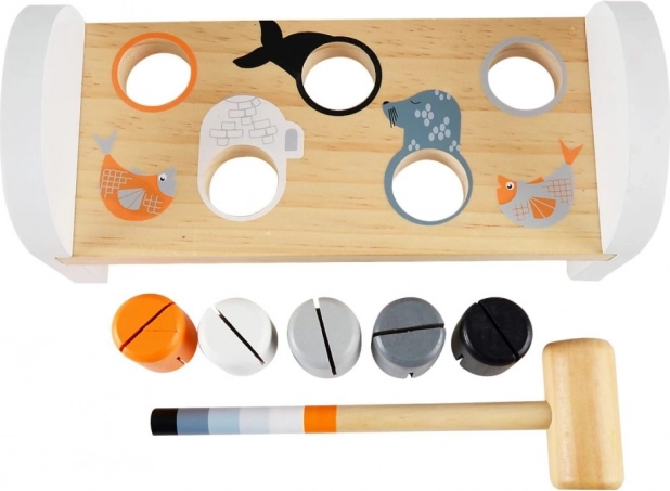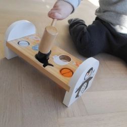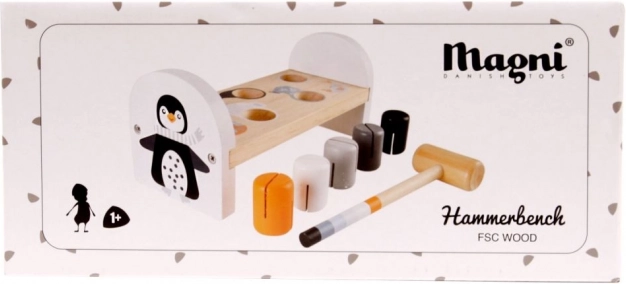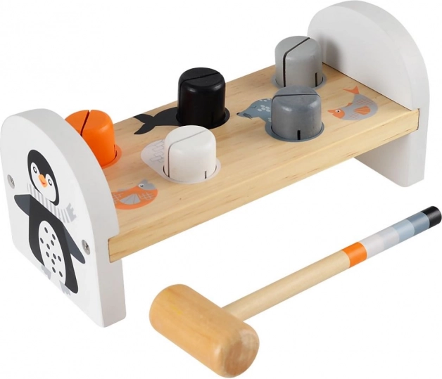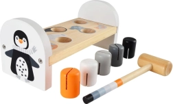 Tato pevná dřevěná zatloukací lavice s roztomilým motivem tučňáka nabízí dětem spoustu zábavy i učení. Děti pomocí kladívka postupně zatloukají barevné kolíky, čímž přirozeně rozvíjejí motorické dovednosti, trpělivost a logické myšlení. Kompaktní rozměry jsou ideální pro malé ručičky a domácí i cestovní hraní.