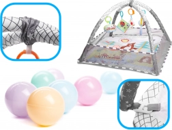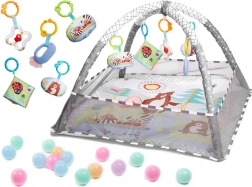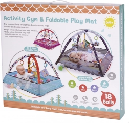Jedna podložka - mnoho možností! Podložka s ohrádkou - dítě ležící na zádech nebo na bříšku může pozorovat okolní prostor. Ohrádka vytváří pocit bezpečí pro dítě i rodiče. Podložka s hračkami zavěšenými na obloucích - barevné hračky zavěšené na obloucích přitahují pozornost dítěte a motivují ho ke cvičení a posilování svalů krku, rukou a nohou. Navíc bude ideální pro první pokusy o samostatné sezení. Suchý bazén - naplněním ohrádky míčky získáte podložku bez oblouků - po odstranění oblouků síť tvořící ohrádku spadne dolů, pak bude podložka dokonalou izolací od chladné země, vymezí hrací zónu a úspěšně nahradí koberec v dětském pokoji. Barevná chrastítka a knížka s přiloženými šustícími stránkami upoutají pozornost batolete a budou stimulovat zrak, sluch a hmat. Navíc budou dokonalým úvodem do světa tvarů a barev. Moderní design a důraz na detail rodiče nadchne.