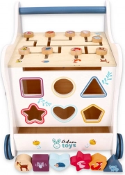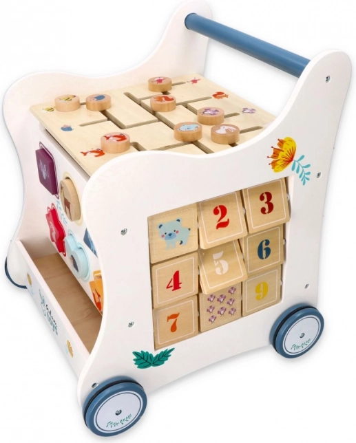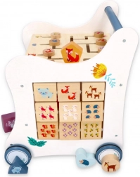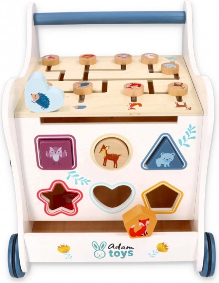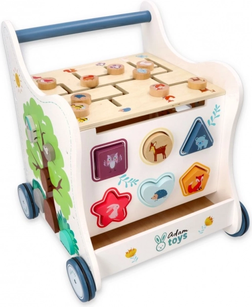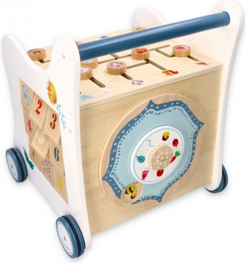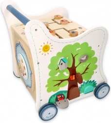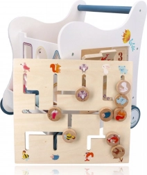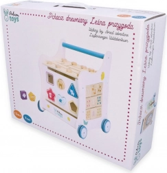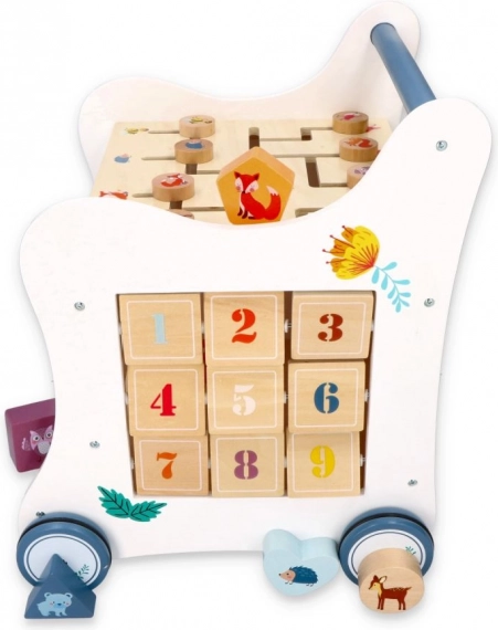 Toto dřevěné pchací chodítko provede vaše dítě světem barev, tvarů a lesních zvířat. Přední panel nabízí zábavnou tvarovou vkládačku, která rozvíjí jemnou motoriku, koordinaci ruka–oko a logické myšlení. Na horní straně čeká labyrint s posuvnými korálky, jenž podporuje trpělivost, plánování a prostorovou představivost. Boční ilustrace se zvířátky inspirují k objevování přírody i k vymýšlení vlastních příběhů.