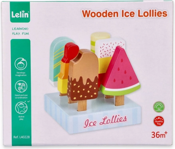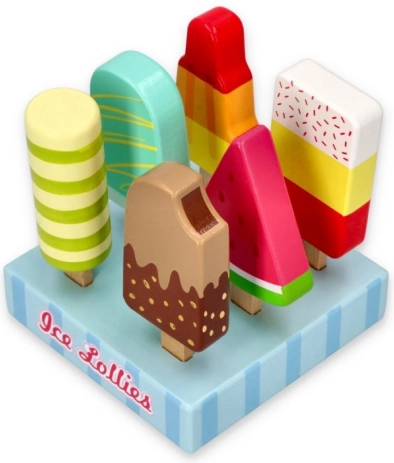 Tato kvalitní sada dřevěných nanuků je perfektní pro malé zmrzlináře. Každý kousek má jedinečný tvar a vzor a díky stabilnímu stojánku se nanuky snadno vystavují i ukládají. Hra na prodejnu či kavárnu pomáhá dětem rozvíjet sociální dovednosti a slovní zásobu.