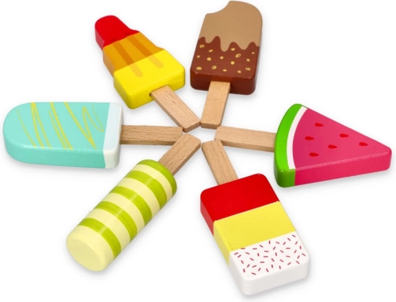 Barevná sada dřevěných nanuků na praktickém stojánku přináší dětem od 3 let hodiny kreativní hry. Podporuje fantazii, roli hraní obchodu a zmrzlinárny a rozvíjí jemnou motoriku i koordinaci oko–ruka. Odolné dřevěné provedení, bezpečné barvy a roztomilé designy zaručí, že se z nanuků stane oblíbená hračka v každém dětském pokoji.
