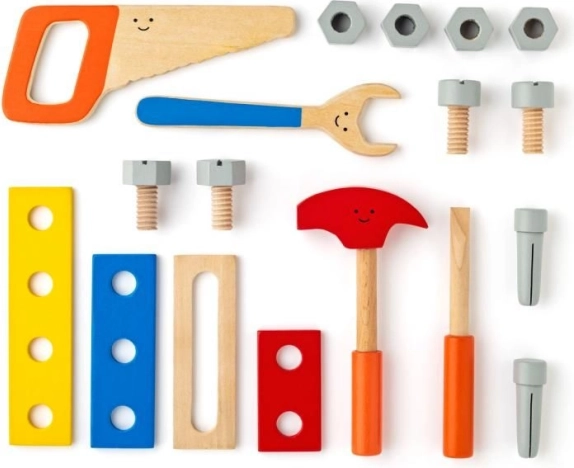 Objevte kouzlo hravého kutí s naší dřevěnou sadou s nářadím. Tato sada je ideální pro rozvoj jemné motriky a koordinace rukou vašeho dítěte.