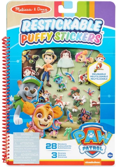 Zábava na cesty i domů: znovunalepovací 3D samolepky s hrdiny PAW PATROL od MELISSA & DOUG. Set nabízí 28 samolepek a 3 scény v praktické spirálové knížce o rozměru 19 × 28 cm. Ideální na cesty pro děti od 4 let, s označením CE.