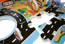 Sada podporuje poznávání provozu – od značky STOP po pracovní stroje. Ideální pro rozvoj slovní zásoby a logického myšlení.