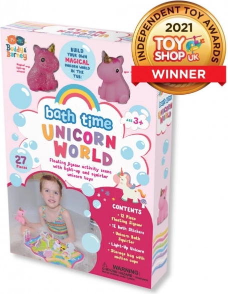 Koupací sada Jednorožčí svět přináší dětem pestrý svět plný jednorožců, zámků a kouzelných cest. Lehké pěnové dílky plavou, skládají se jako puzzle a po navlhčení drží na hladkých plochách koupelny. Děti tak mohou vyprávět vlastní příběhy a rozvíjet fantazii přímo ve vaně.