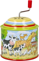 Hrací skříňka je zdobena barevnou ilustrací farmy s postavičkami jako jsou krávy, koně, kočky a slepice.