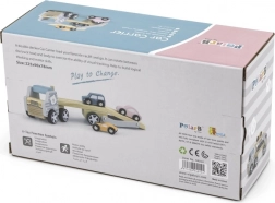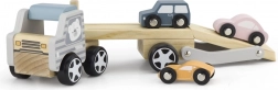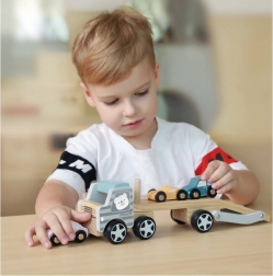 Dvouúrovňový přívěs se sklopnou rampou podporuje realistickou hru a učení sekvencí – děti nakládají a vykládají autíčka samy.