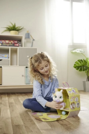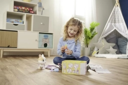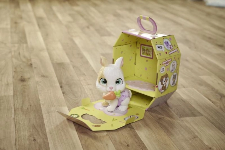 Králíčka snadno vezmete kamkoli s sebou díky papírovému balení s rukojetí, které slouží jako přenosný domeček. Uvnitř navíc čekají papírové sáčky s překvapením – tematické doplňky pro ještě více herních scénářů. Magická tlapka prozradí pohlaví mazlíčka a pomůže dětem vytvořit si k němu osobní vztah.