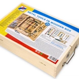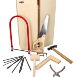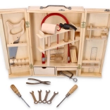 Tato kompaktní a přenosná sada obsahuje pečlivě uspořádané kovové nástroje v pevném dřevěném boxu s rukojetí. Díky jasnému uspořádání jsou všechny díly rychle po ruce a bezpečně uložené, což z ní dělá skvělou volbu pro malé kutily i rodiče, kteří ocení pořádek a bezpečnost.