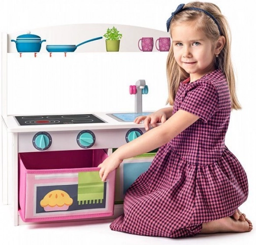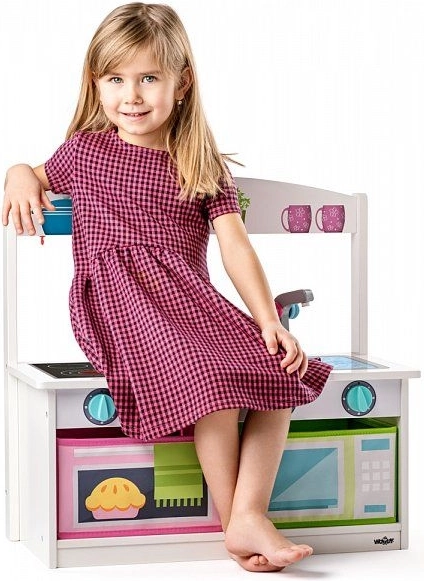 Tato multifunkční dřevěná kuchyňka a lavička 2v1 nabízí dětem hodiny zábavy a praktické využití v jednom. Kuchyňka je vybavena vařičem s otočnými knoflíky, dřezem s kohoutkem a úložnými přihrádkami připomínajícími troubu a mikrovlnku. Díky stabilní konstrukci je vhodná pro každodenní hraní i sezení.