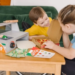 Obsahuje dřevěnou pizzu, různé přílohy a hrací peníze, což umožňuje dětem zažít celý proces přípravy a prodeje pizzy.