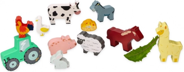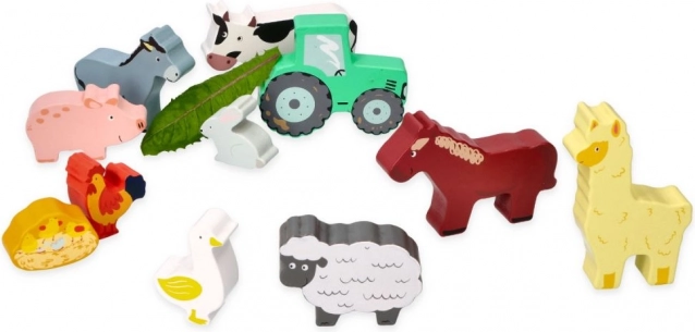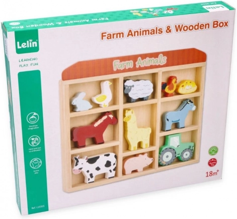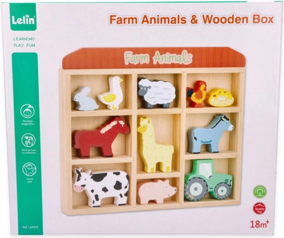 Tato sada obsahuje různé zvířátka jako kravičku, koníčka, ovečku, prasátko, slepičku a další, včetně malého traktoru pro ještě větší zábavu. Vše je uloženo v praktickém dřevěném rámu, který slouží i jako úložný prostor.